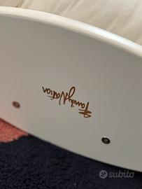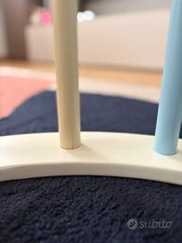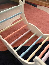 L'oggetto è NUOVO, usato circa 2-3 volte per far dondolare le bambole. Non presenta segni di usura o graffi • Multifunzione: Può essere usato come dondolo rilassante (con il cuscino), come struttura per arrampicata (capovolto) o come tunnel/capanna per il gioco simbolico. • Sviluppo motorio: Aiuta il bambino a sviluppare equilibrio, coordinazione e agilità secondo i principi Montessori. • Materiali di qualità: Struttura solida in legno con colori atossici e design curato nei minimi dettagli. • Comfort: Il cuscino è specifico per questo modello, morbidissimo e dotato di laccetti per fissarlo saldamente ai pioli. Dettagli tecnici: • Età consigliata: dai 12 mesi in su. • Dimensioni: circa 80 x 50 x 45 cm. • Portata: fino a 30-50 kg. Presenta una lesione in una barra (presente fin dall’acquisto) che non influisce sull’utilizzo.