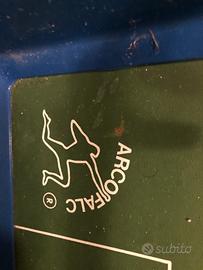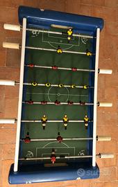 Oggetto da collezione modernariato, calcio Balilla ARCOFALC degli anni 70, con gambe in metallo laccate di bianco e struttuta di gioco in plastica azzurra.