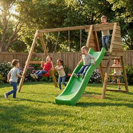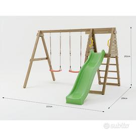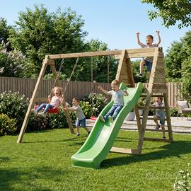 Maxplay Gym è un’area gioco in legno di alta qualità, impregnata in autoclave per garantire resistenza e durata anche alle intemperie. Pensata per stimolare il movimento dei bambini, combina una doppia altalena, uno scivolo e una scala, offrendo numerose attività in un unico spazio compatto. La struttura robusta e sicura è ideale per sviluppare equilibrio e coordinazione, trasformando il giardino in un vero parco giochi privato. - Scivolo verde, due altalene, scala - Dimensioni assemblato: 337 x 299 x h 202 cm - Numero piattaforme: 1 - Dimensione piattaforma: 89x80 cm - Altezza piattaforma da terra: 120 cm - Lunghezza scivolo: 2,2 m - Adatto a bambini dai 3 ai 10 anni. - Prodotto conforme alla Normativa di sicurezza europea UNI EN 71. I nostri giochi sono concepiti per essere utilizzati ad uso privato e non pubblico. Cosa significa? Per suolo privato si intende un’area di gioco sorvegliata da adulti, per esempio un giardino privato, un condominio o una scuola. Per suolo pubblico si intende invece un'area aperta al pubblico e non sorvegliata (in questo caso i giochi richiedono standard di sicurezza rigorosi e certificazioni conformi alla legislazione nazionale). Consigliamo il montaggio in 2 persone. Tempo di montaggio: 3 ore. Numero massimo di bambini: 6 Peso massimo utilizzatore: 50 kg Il set comprende: • Scivolo verde ondulato utilizzabile anche come scivolo ad acqua collegando un tubo da giardino all’attacco sul retro, nella parte superiore dello scivolo • 2 seggiolini per altalena (rossi) con corde di sospensione regolabili • Set di legno pretagliato impregnato in autoclave (montanti, travi e pioli) • 4 ganci/supporti per altalena • Set di ferramenta per il montaggio (viti, bulloni e copribulloni) • Ancoraggi per fissare gli elementi al suolo • Istruzioni di montaggio passo dopo passo • Maniglie di sicurezza gialle Struttura in legno impregnato in autoclave, resistente a funghi, muffe e agenti atmosferici, assicurando sicurezza e durabilità nel tempo.
