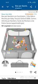 Area gioco ( box ) per bambini molto spazioso , dotato di maniglie colorate che permettono ai bambini di aggrapparsi e due porte chiuse con cerniera , tutta la struttura e ricoperta da imbottitura per evitare urti . Misure 150 x 180 . Usato pochissimo e conservato nella sua borsa con maniglie per un facile trasporto .