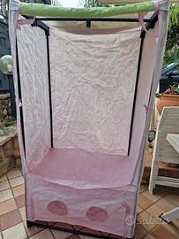 Vendo 2 armadi portatili in stoffa tessuto tnt per bambina, con scomparto inferiore separato dal porta abiti. Dotato di cerniere di chiusura, una delle quali in un armadio è non funzionante come da foto, qualche segno di usura nella stoffa.