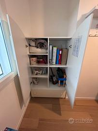 Marca PALI. Armadio in legno laccato bianco: dimensioni larghezza 100 cm, profondità 50 cm, altezza 180 cm. Scomparti capienti, ripiani come in foto o rimodulabili. Cassettone giochi in basso, profondità 24 cm.