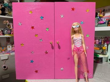 Armadio di Barbie in legno fatto a mano completo di vestiti. L'armadio è in scala come visibile dall'accostamento della Barbie non inclusa.