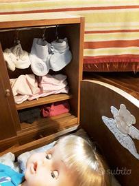Bellissimo armadio per vestitini i, con ante scorrevoli, gancini per appendere e mensolina interna + lettino basculante con materassino. Entrambi in legno, fatti artigianalmente, con decorazioni in tema cicciobello . Cedo a soli 35 euro