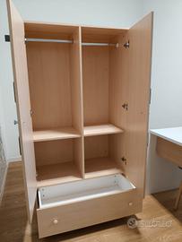 armadio per bambini come nuovo. sulle ante sono presenti specchi a forma esagonale. è composto da due ante con barre per appendere e mensole e cassettone estraibile nella parte bassa. misure: h 170cm, larghezza 90cm, profondità 46cm. colore legno chiaro.