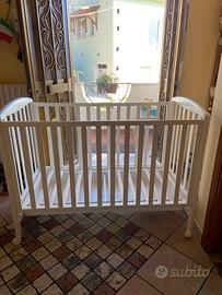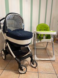 Lettino bianco con materassino della Foppapedretti in alternativa uno di colore legno, un passeggino della Brevi Jeanse ed un passeggino Peg Perego bianco e blu modello book 51 compreso di Ovetto primo viaggio neonati , culla e seggiolino prime pappe.Per intrressati tutto in blocco no separatamente, in più diversi gadget in regalo