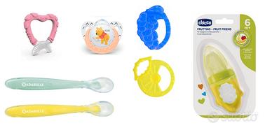 Articoli vari per neonati: - 2 Massaggiagengive Soft Relax Chicco, blu e giallo adatti dai 2 mesi in su. - Succhietto retina per alimenti Chicco , adatto dai 6 mesi in su. - Succhietto Winnie the Pooh in silicone, marca HUK, adatto da 0 a 6 mesi - Massaggia gengive marca Nuvita, adatto dai 4 mesi in su. - Set di 2 cucchiai morbidi in silicone per bambini, marca Badabulle.