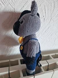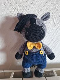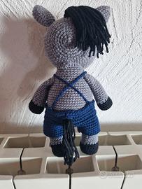 Dolce asinello realizzato all'uncinetto, perfetto come peluche o decorazione. - Colore grigio e nero - Dettagli con salopette blu e papillon giallo - Occhi neri di sicurezza. - in pura lana merino 100%. - Asinello e vestiti fatti a mano.