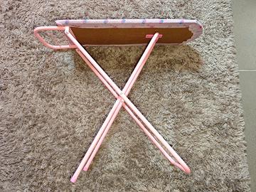 Struttura in metallo rosa pieghevole, molto stabile, con piano rivestito in tessuto fantasia cuori. Il ferro è in plastica, leggero, con serbatoio azzurro trasparente e tasto superiore, perfetto per il gioco di imitazione delle faccende domestiche, adatto dai 3 anni in su come gioco di ruolo educativo e divertente🙂🤗
