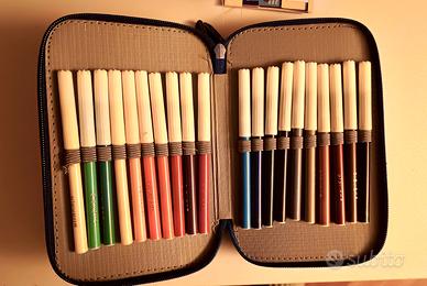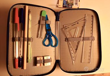 Splendido e super-completo astuccio a tre scomparti (3 zip), perfetto per la scuola primaria e secondaria. L'astuccio è della marca **Eleven** (distribuito da **Due Esse s.r.l.**), brand noto per la qualità dei suoi prodotti scolastici. Il design esterno presenta un'accattivante grafica a tema calcistico con la bandiera italiana (tricolore verde, bianco, rosso sullo sfondo) e stilizzazioni di calciatori in azione e un pallone da calcio. È l'ideale per i giovani tifosi della Nazionale o per chi ama il calcio! È COMPLETAMENTE FORNITO! Non dovrai comprare nulla separatamente. All'interno troverai tutto il necessario di marca **Eleven**, perfettamente organizzato con elastici. Scomparto 1 (Cancelleria di Base): * 2 Penne a sfera (1 rossa, 1 blu) con tappo * 1 Matita standard in legno * 1 Penna ricaricabile con fusto verde * 1 Confezione di mine di ricambio (fusto verde) * 1 Paio di forbici con punta arrotondata (blu) * 1 Temperamatite singolo in plastica * 1 Gomma per cancellare con fascetta protettiva **Scomparto 2: * Set completo di **pennarelli a punta fine** con tappo bianco ventilato. **Scomparto 3 : * Set completo di **matite colorate in legno** ( inclusa una matita bianca speciale). Non è mai stato usato. Presente l'etichetta originale **Eleven / Due Esse s.r.l.** ancora attaccata con il filo di plastica (Vedi foto). Le cerniere sono robuste e funzionano perfettamente. L'esterno è pulito e i colori sono vividi. L'interno è pulito e ordinato. Tutto il materiale da scrittura e disegno è in ottime condizioni. Perché Acquistarlo? È la soluzione "chiavi in mano" ideale per l'inizio dell'anno scolastico. Risparmia tempo e denaro comprando un set già completo di alta qualità. Perfetto anche come regalo per un bambino appassionato di calcio! Tutto il materiale è originale, i pennarelli potrebbero non scrivere bene, non vengono sostituiti per mantenere il prodotto integro.