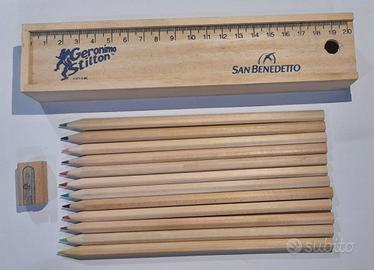 Astuccio di legno con righello scorrevole di 20 cm, con 12 matite colorate e un appuntalapis. Un gadget delle acque San Benedetto per Geronimo Stilton. In condizioni ottime come da foto. OGGETTO INTROVABILE