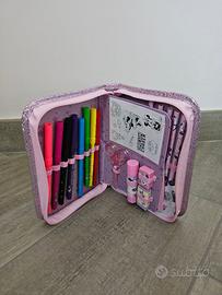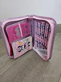 Astuccio scuola Minnie Disney Junior, 1 zip (NUOVO - MAI USATO), completo di 9 matite colorate, 8 pennarelli, 1 forbice, adesivi, 1 colla, 1 gomma, 1 temperino, 1 stencil e 1 mini blocco note.