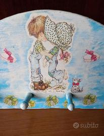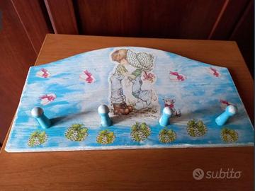 Delizioso attaccapanni in legno con 4 pomelli, ideale per la cameretta dei bambini, decorato con una delicata immagine di Sarah Kay. Dimensioni massime 35x20 cm.