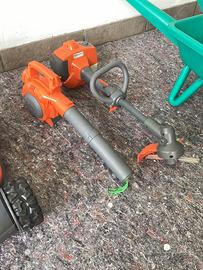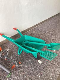 Taglia erba, soffiatore per foglie e taglia bordi sono a pile ed emettono suoni reali degli attrezzi. Cariola, rastrello e pala in plastica