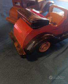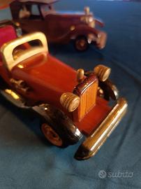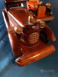 Set di 2 modellini di auto d’epoca in legno, realizzati artigianalmente con diversi tipi di legno.