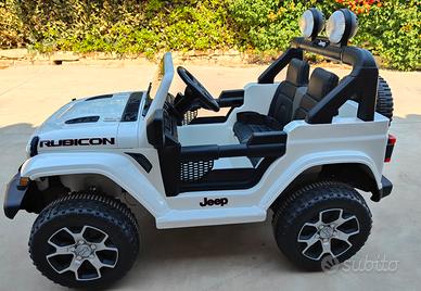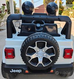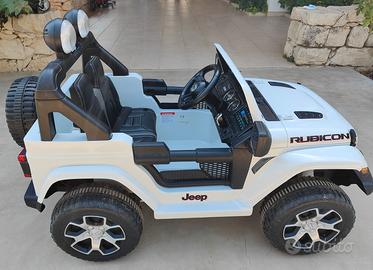 Vendo auto elettrica per bambini Jeep Rubicon biposto con sedili in pelle usata pochissimo come nuova perfettamente funzionante. Equipaggiata con connessione MP3, USB e SD CARD luci a Led integrate, telecomando parentale 2.4G con tre modalità di controllo e carica batterie.