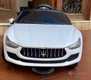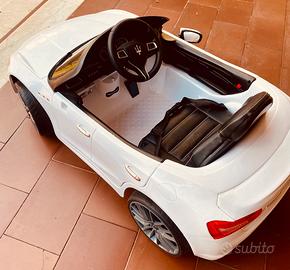 Maserati Ghibli. Fari LED, sedile in plastica, ruote in plastica dura con battistrada in gomma. Chiave di accensione: No Parental Control. Volante multifunzionale. Tempo di ricarica: 5-8 ore. Porte laterali apribili. Attacco MP3, USB e Micro SD. Cinture di sicurezza. Accelerazione tramite pedale e telecomando. Marcia in avanti e retromarcia anche da telecomando.