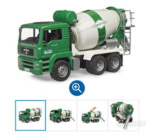 Vendo autobetoniera MAN TGA della ditta tedesca Bruder. La cabina di guida è ribaltabile e consente di vedere il basamento. Il tamburo della betoniera può essere ruotato utilizzando la manovella montata nel serbatoio dell'acqua. Il tamburo contiene una coclea di trasporto e miscelazione e, esattamente come l'originale, lo scarico avviene invertendo il senso di rotazione. La coclea all’interno del tamburo trasporta quindi il materiale all’indietro, fino allo scivolo di uscita. Sono disponibili due lamiere di scarico applicabili. Prodotto in materie plastiche pregiate, ad es. ABS