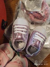 Due set calzettini, circa 40 paia, 10 tutine corte, 4 tutine lunghe, 3 paia di scarpine, retina antizanzare, porta-bimba incorporato.