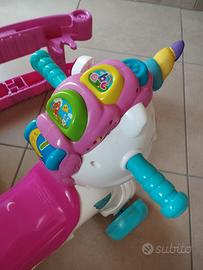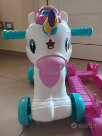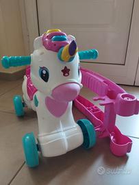 Un fantastico unicorno a dondolo che è anche un cavalcabile e un centro attività interattivo per volare sulle ali della fantasia. L'unicorno grazie ad un sensore, riconosce l'attività del movimento e intrattiene il bambino con effetti sonori realistici, simpatiche frasi e canzoncine. Se il bambino accarezza la stellina sul muso dell'unicorno, la stellina si illumina e l'unicorno interagisce con il piccolo invitandolo a prendersi cura di lui. I tasti sulla criniera insegnano lettere, versi e nomi degli animali mentre è possibile imparare i numeri grazie al rullo girevole. Ricco di canzoncine e simpatiche filastrocche. Stimola la motricità, lo sviluppo affettivo e del linguaggio.