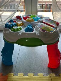 Dispone di effetti luminosi, canzoncine, filastrocche e un libriccino interattivo. Le gambe del tavolo sono removibili per permettere il gioco anche a terra. Include attività per imparare numeri, lettere, forme, colori e i nomi/versi degli animali.