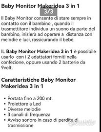 Salve,vendo baby monitor come nuovo,usato pochissimo,con proiettore a led,con portata fino a 200mt. € 20 no perditempo solo consegna a mano