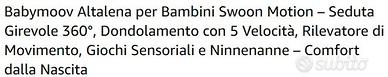 Altalena babymoov in buono stato vendo a € 50. Funziona a corrente (non con le batterie). Ritiro zona Piazza Sempione Altalena babymoov in buono stato vendo a € 50. Funziona a corrente (non con le batterie). Ritiro a mano in zona Piazza Sempione