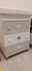 Caratterizzato da tonalità all’insegna del bianco e grigio, sui tre ampi cassetti ha decorazioni con teneri cuori che racchiudono un dolcissimo orsetto. Ha ruote gommate antigraffio, con sistema frenante, per facilitare gli spostamenti.