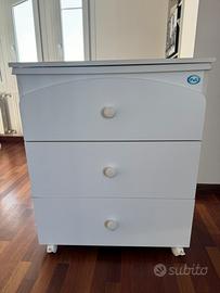 Bagnetto fasciatoio Birillo della Pali con 3 ampi cassetti, vaschetta per il bagnetto. Completa di 4 ruote piroettanti di cui 2 con freno.