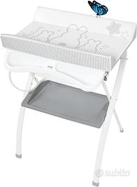Bagnetto Fasciatoio Brevi con vaschetta per bagnetto integrata, pieghevole e ben conservato. Un angolo della plastica che copre il materassino del fasciatoio e' leggermente rovinato. Prodotto molto utile e pratico.