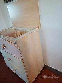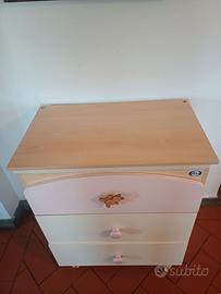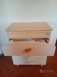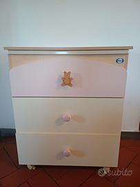 Il bagnetto fasciatoio Pali è dotato di una vaschetta anatomica e di cassettiera. Dotato di tre ampi cassetti e base con ruote. Misure 89 x76 x 45 cm