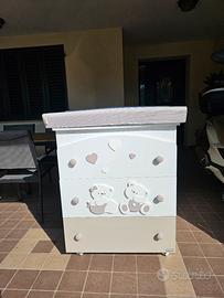 La struttura del bagnetto fasciatoio Erbesi Mirtillo e in truciolare certificato E1 a bassa emissione di formaldeide rivestito in PVC, la vaschetta per il bagnetto e anatomica e antiscivolo.