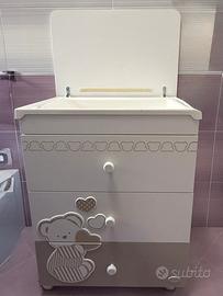Il bagnetto fasciatoio in legno è trasformabile in comoda cassettiera a 3 cassetti, caratterizzato da forme armoniose e teneri decori di orsetti sui cassetti.