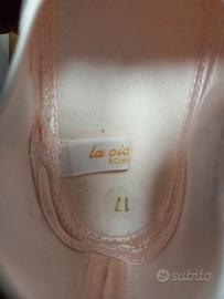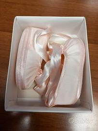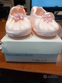 Ballerina neonata battesimo marca "La Cicogna Roma" musira 17 di colore rosa con strighe e fiocco. Prodotto Made in Italy con confezione originale