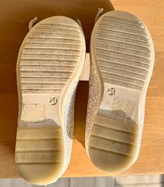 Ballerine bianche eleganti MariRose per bambina, misura 24, esternamente ricoperte interamente di glitter tono su tono, con fiocchetto decorativo in punta e soletta in vera pelle.