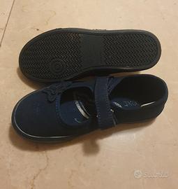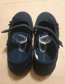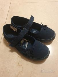 Scarpe ballerine per bambina, colore blu, marca Next, chiusura con cinturino col velcro, applicazione di una farfallina blu sul lato, suola in gomma, misura 31. Usate pochissimo, quasi pari al nuovo.