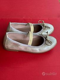 Ballerine da bambina N.28 ma vestono poco. Colore beige/dorato. Con fascetta e fiocchetto. Plantare morbido e comodo. Usate, ma ancora in buone condizioni.