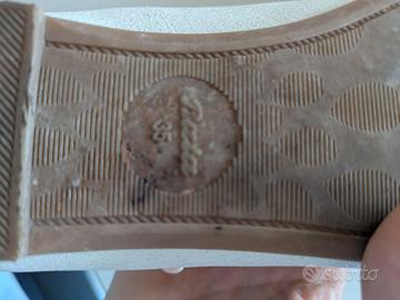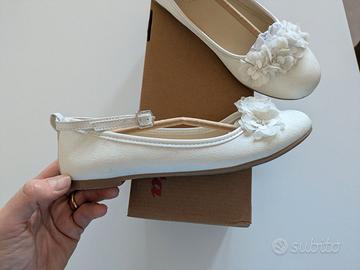 Ballerine da cerimonia bambina Bata, beige con piccoli brillantini in mezzo, decorate con fiori in punta e cinturino regolabile alla caviglia, suola in TPR resistente e antiscivolo. Taglia 35, praticamente nuove, usate solo il giorno della comunione. Ancora in vendita in negozio.