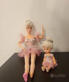 Entrambe le bambole indossano abiti da balletto rosa con tutù e maniche a sbuffo, e scarpette da ballo rosa.