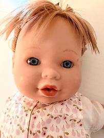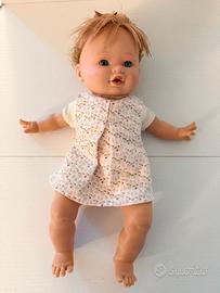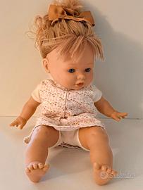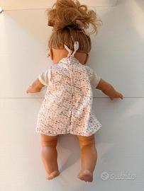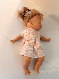 Vendo bambola marca Antonio Juan con vestito a fiori. La bambola è usata e ben tenuta. Da segnalare due macchie ingiallite sul vestito, nonostante sia stato lavato. E' presente un vano batterie per permettere alla bambola di parlare, ma la bambola non è stata testata. Peso 375g. Altezza 33cm.