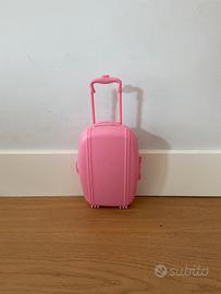 Bambola alta 45 x 20 cm, puoi togliere il cappellino, le calze e scarpe e cappottino; schiacciando la mano sinistra e il bottone sotto il vestito dice molte frasi. Ha anche una valigia con dentro accessori per i suoi capelli.