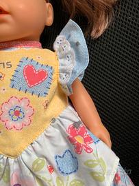 Bambola che parla e canta in inglese, alta circa 30 cm. Capelli ramati lucidi e saldi, occhi azzurri fissi, vinile in ottime confizioni. Sul vestitino ci sono piccole macchie di pennarello, visibili in foto, ma che si confondono col disegno. Contatti solo sulla piattaforma