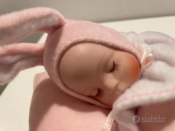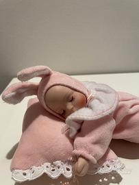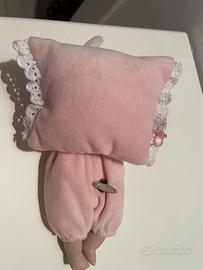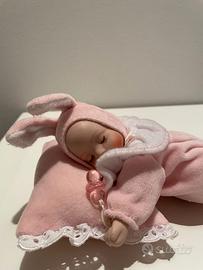 Bambola coniglietto carillon. Suona la ninna nanna di Brahms e si muove. Testa, piedi e mani in ceramica.