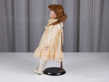 Splendida bambola da collezione realizzata in porcellana, completa di supporto espositivo. L’estetica è quella classica delle bambole “Heritage” o “Victorian style”, con ricercati dettagli artigianali.