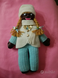 Bambola di pezza con la pelle scura, alta 37 cm circa. L'ho realizzata per mia figlia che ormai è grande ed ora cerca un'altra bimba che le voglia bene. La manina in foto è stata riparata