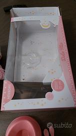 in ottimo stato bambola di dimensione 35 cm con cappellino forchetta e cucchiaino e ciotole una piccola e una di dimensioni più grande dell'altra tutto di colore rosa