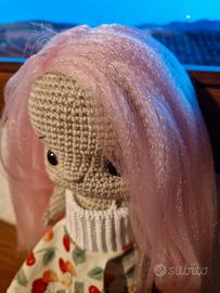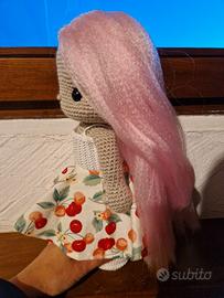 Bambola fatta a mano all'uncinetto con capelli lunghi rosa. - Vestito con fantasia di ciliegie. - Scarpe all'uncinetto abbinate,con ciliegie - Fatta a mano bambola,vestiti e scarpe. - Ideale anche come regalo.