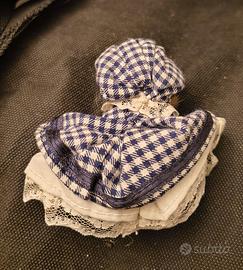 Deliziosa bambola in porcellana con un grazioso vestito. - Vestito a quadri blu e bianco. - Dettagli in pizzo. - Cappuccio abbinato.