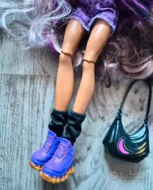 Gli accessori includono una borsetta nera e stivali viola con plateau.