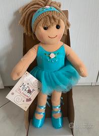 Bambola My Doll, nuova con etichetta e confezione originale, prodotto artigianale, lavorato a mano, materiale in stoffa, capelli in lana, altezza cm 32, bambole da collezione, soggetto ballerina con tutù azzurro, abito removibile, bambola da collezione